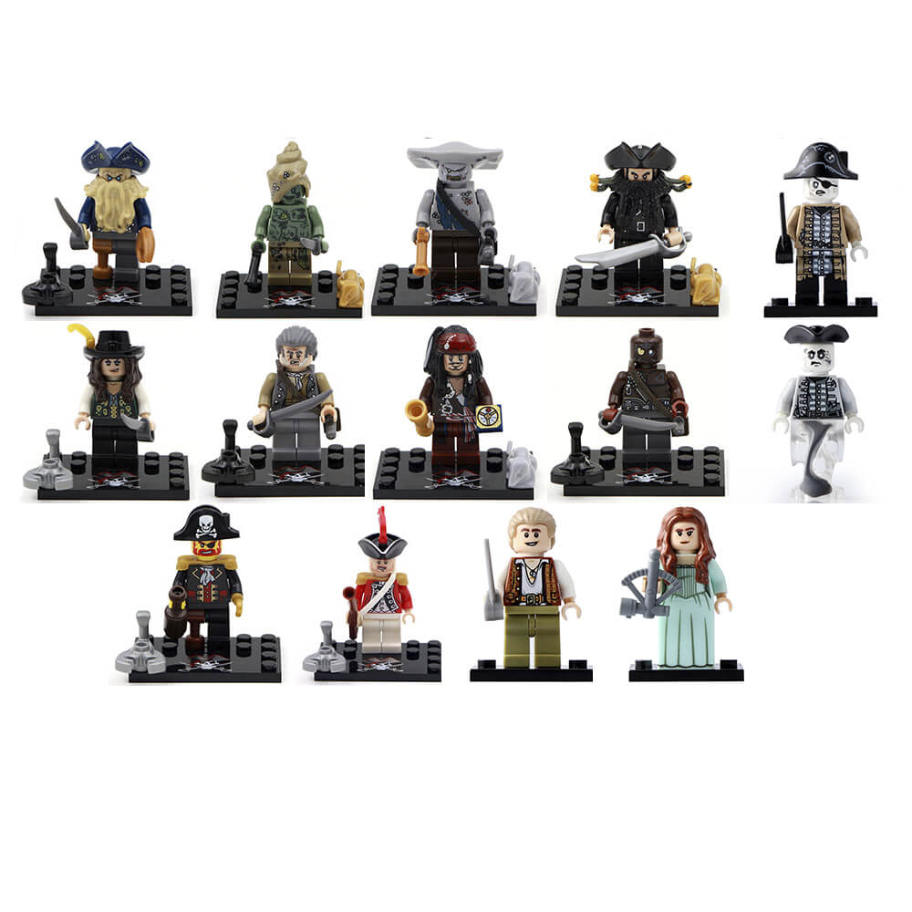 Набор фигурок Пираты, 14 шт совместимый с лего повторяет героев фильма Пираты Карибского моря. Пластиковые коллекционные детские мини фигурки выполнены в стиле персонажей из фильма и оснащены характерными им атрибутами – пистолеты, ножи, лук и другим видом оружия. Игрушки для детей могут вращать руками и ногами. Они совместимы со всеми конструкторами lego. Набор фигурок лего для детей включает всех полюбившихся персонажей - Капитан Джек Воробей, капитан Летучего Голландца Дейви Джонс и его дочь Анжелика, члены экипажа Летучего Голландца Хадрас, Маккус, пират Черная Борода, одноглазый лейтенант Лесаро, помощник Джека Воробья Джошами Гиббс, Боцман, Сантос, Капитан Рыжая борода и его дочь Карина Смит, Офицер короля Георга, Генри.