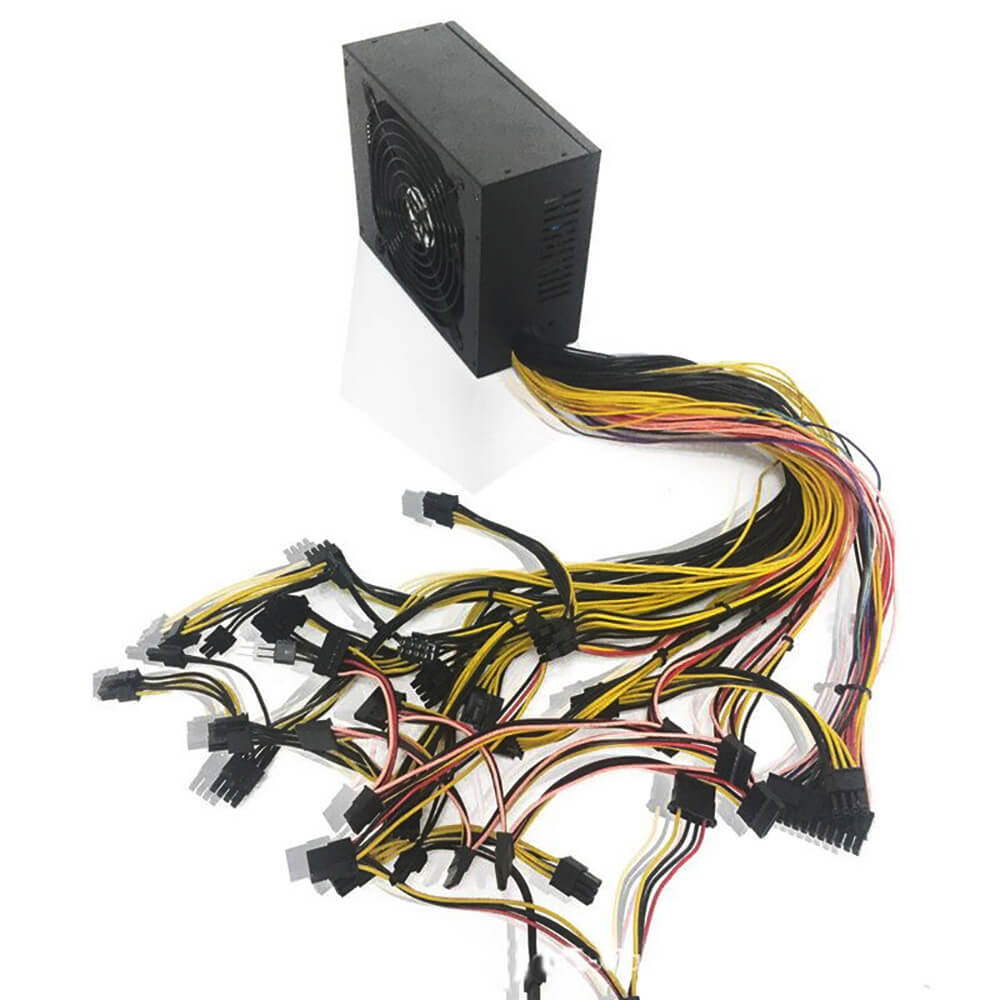 Блок питания для компьютера 2000W для майнинга на 8 видеокарт многоканальный оснащен надежной системой безопасности от перенапряжения, перегрузок, короткого замыкания. Оборудование для майнинг фермы рассчитано на 180-240 В входного напряжения, 15/8 А входного тока и 47/63 Гц. Внешне представляет собой блок с кулером для охлаждения собранной системы и выходящими кабелями для подключения. Компьютерный блок питания имеет металлический корпус, который также дополнительно отводит тепло. В комплекте с БК для ПК идет вилка европейского стандарта.
