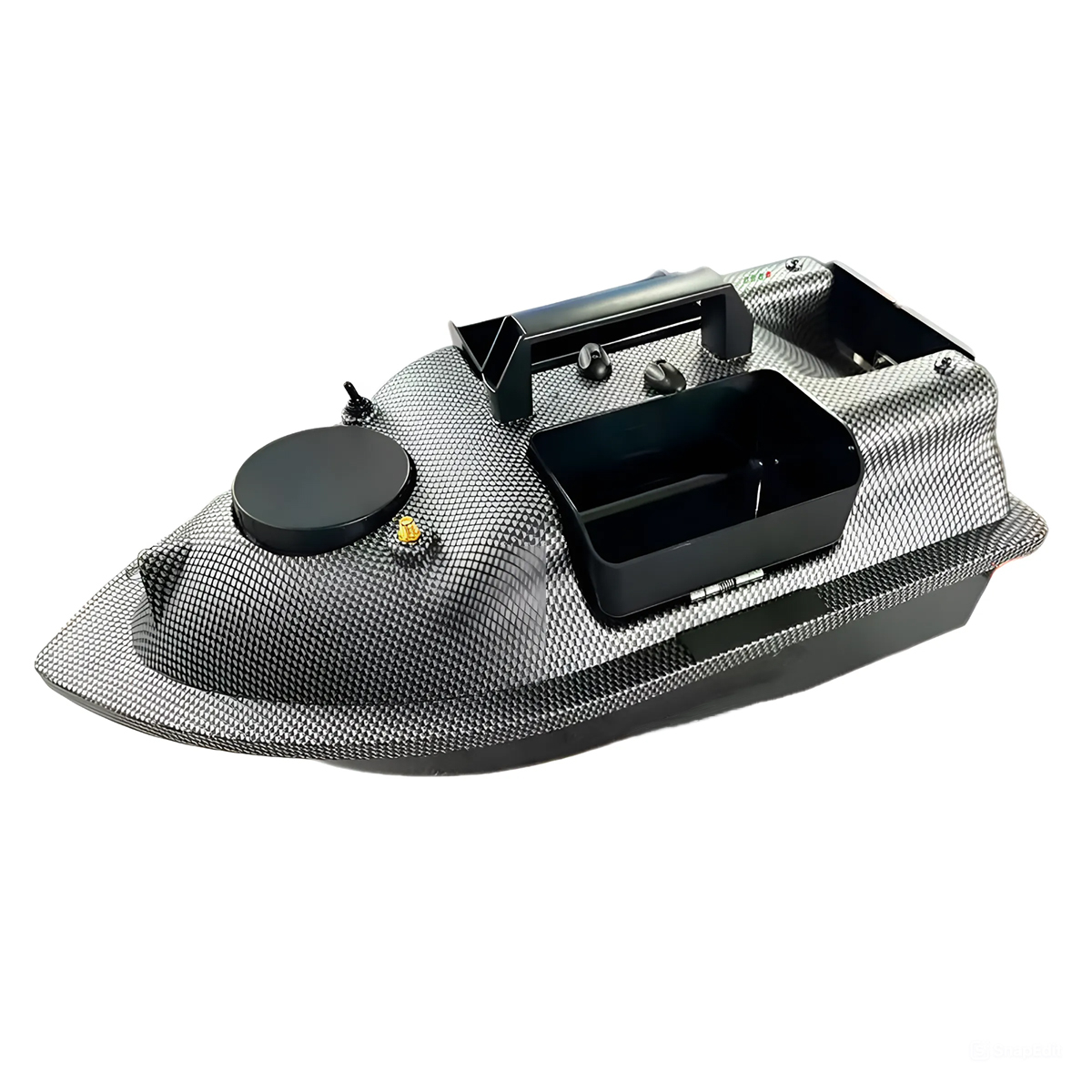 Радиоуправляемый прикормочный кораблик с пультом со встроенным дисплеем, на котором отображаются основные параметры и управление GPS навигацией. ПУ управляют винтами по отдельности.