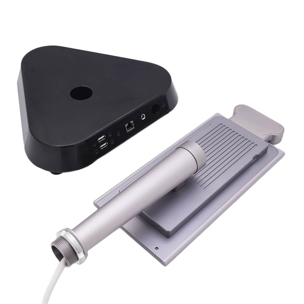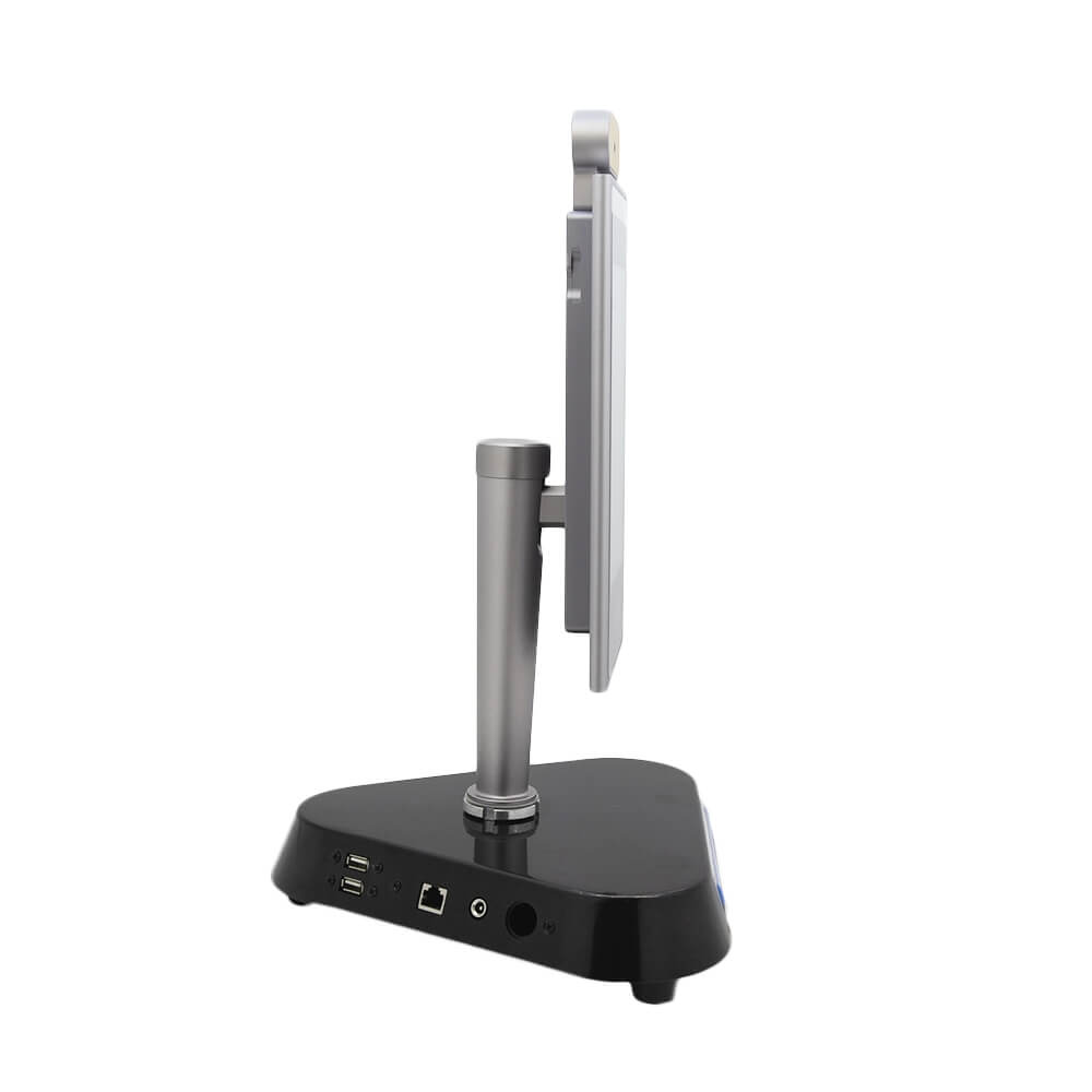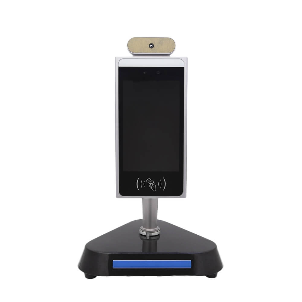 Бесконтактный термометр для дистанционного измерения температуры предназначен для контроля температуры тела и проходящих мимо него людей. Прибор рассчитан на большую пропускную способность и производит замер температуры всего за 0ю2 секунды. В прибор интегрирована видеокамера и цветной ЖК дисплей диагональю 8 дюймов. Встроенная в прибор система идентификации по пластиковым карточкам позволяет строить на его основе систему допуска в помещение. Результаты замеров сохраняются на карте памяти объемом до 8 Гб. Прибор выполнен в настольном исполнении, в комплекте специальная подставка с двумя портами USB, портом RJ-45 и входом питания. Кронштейн позволяет регулировать поворот и наклон прибора.
