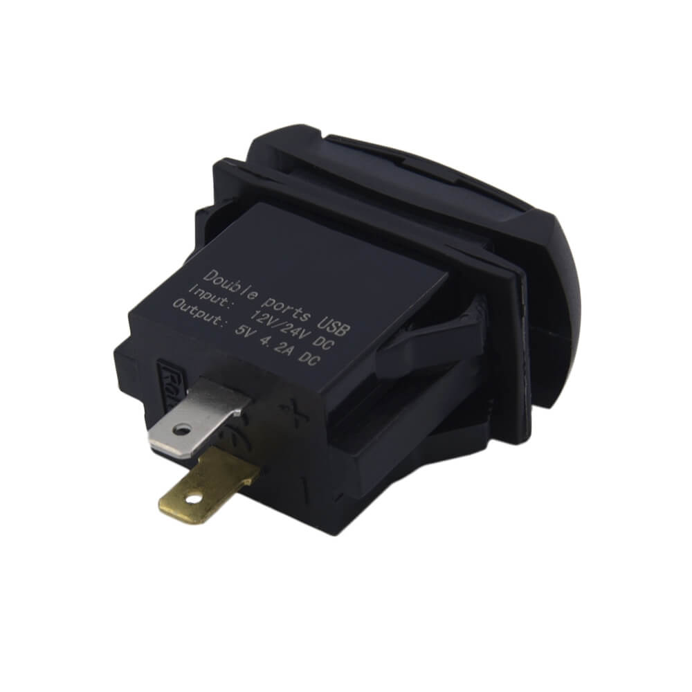 Встраиваемый в панель преобразователь на два порта USB. Устройство подключается к бортовой сети автомобиля 12 В или 24 В. Ток каждого порта составляет 2,1А. Преобразователь устанавливается в прямоугольное монтажное отверстие и фиксируется специальными защелками. На заднюю стенку устройства выведены две плоские клеммы для подключения входного напряжения.