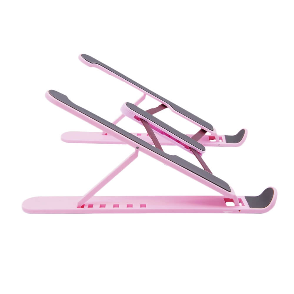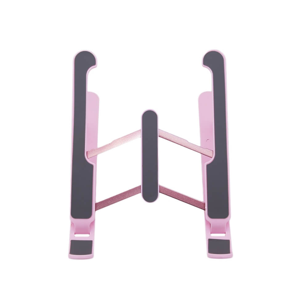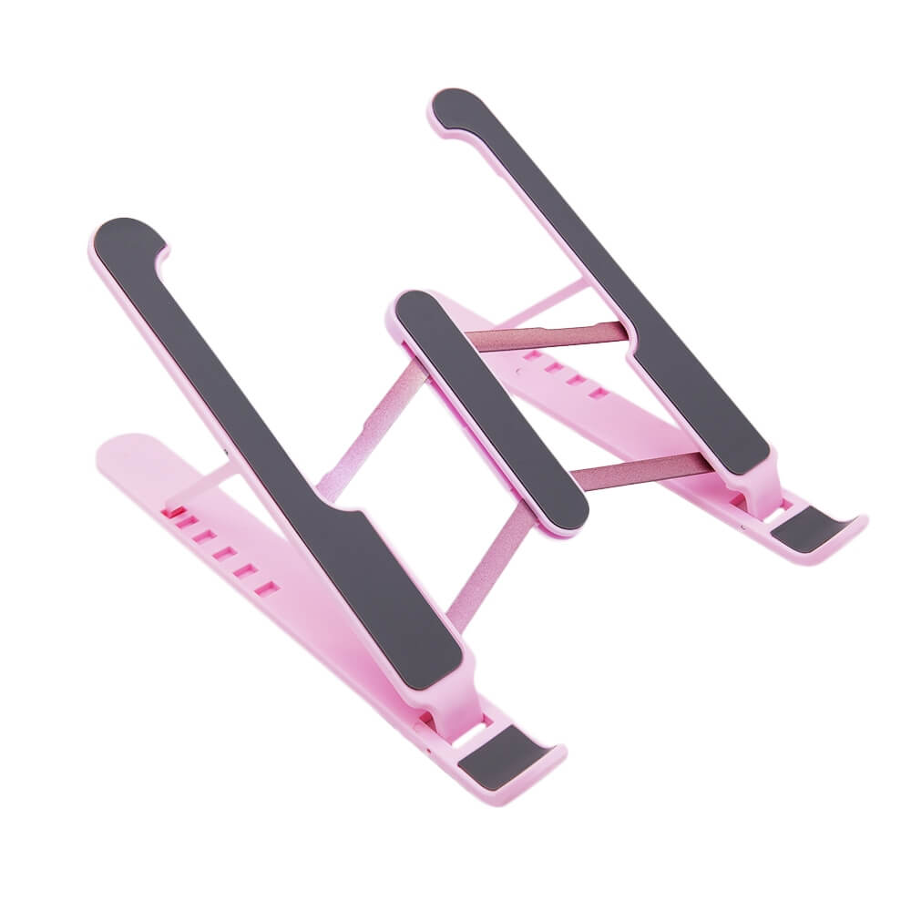 Складная подставка под ноутбук из алюминиевого сплава и ABS-пластика. Предусмотрены противоскользящие накладки. Угол наклона регулируется в семи плосткостях. Подставка окрашена в нежный розовый цвет. Вес приспособления - 230 грамм.