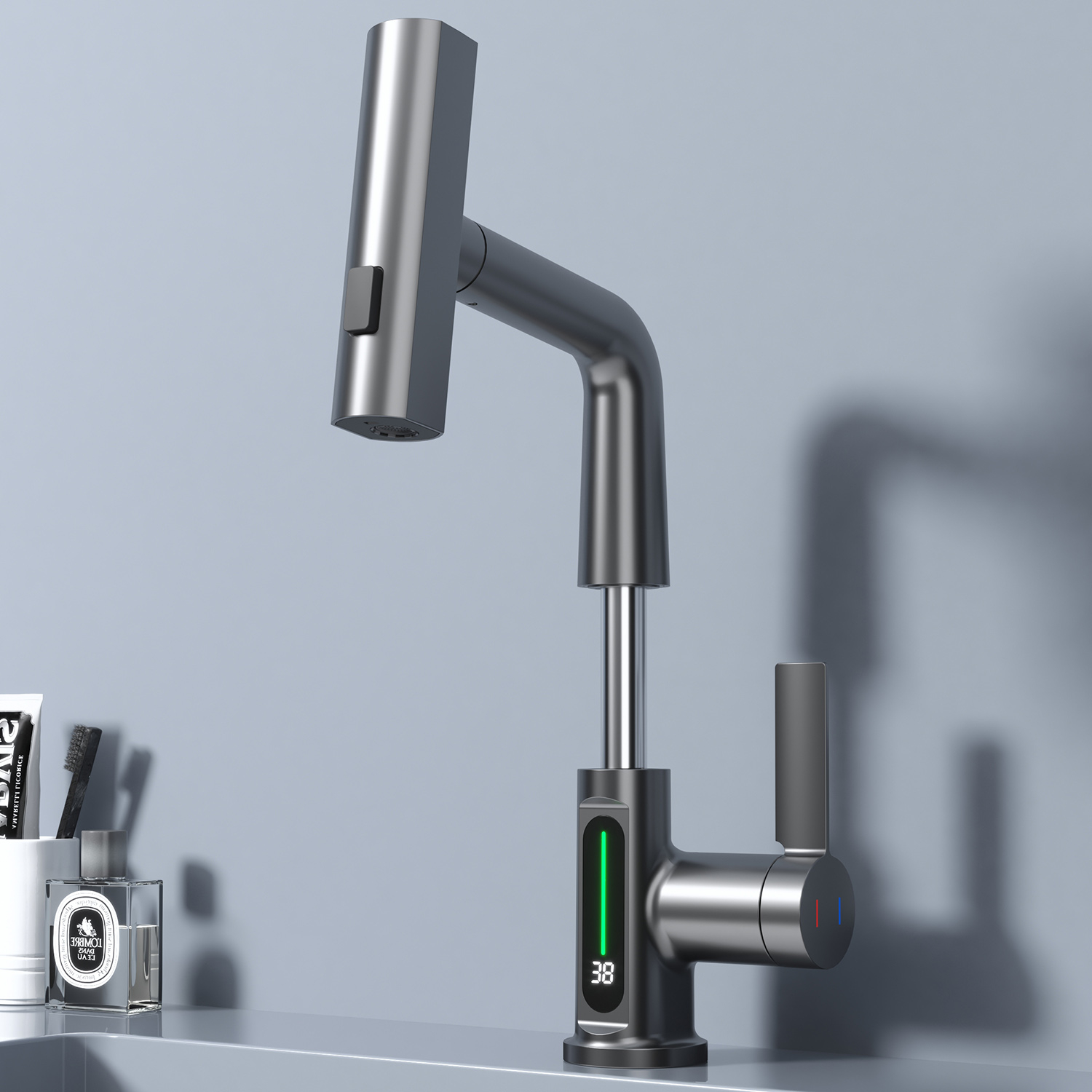 Необычная особенность этого смесителя - цветовые режимы, меняющиеся в зависимости от температуры воды: синий (0-30°С), зеленый (30-40°С), красный (40 °С и более), что делает его не только функциональным, но и стильным элементом вашей кухни.
